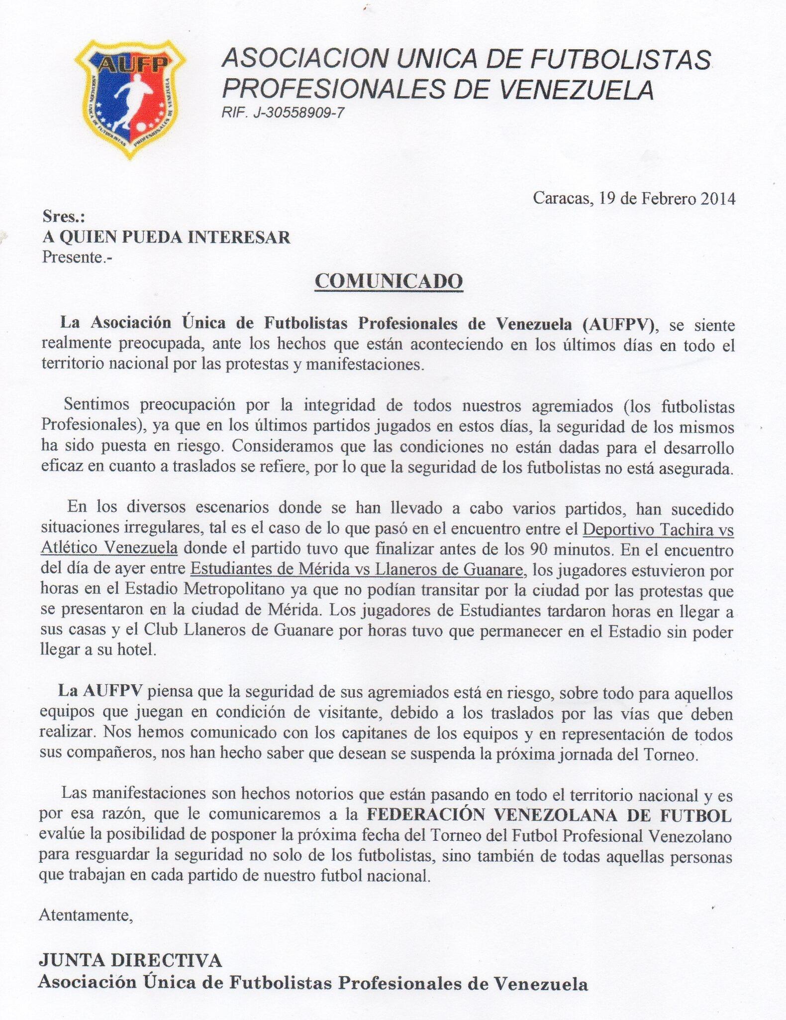 GradaDigital.com – A tempranas horas de este miércoles (19 de febrero), la Asociación Única de Futbolistas Profesionales de Venezuela (AUFPV) expresó mediante un comunicado su preocupación por los hechos que acontecen en el territorio nacional, y mucho más por la integridad de todos sus agremiados (futbolistas profesionales), ya que la seguridad de los mismos ha sido expuesta a riesgos, teniendo que cumplir el calendario oficial del Torneo Clausura 2014 de la FVF.