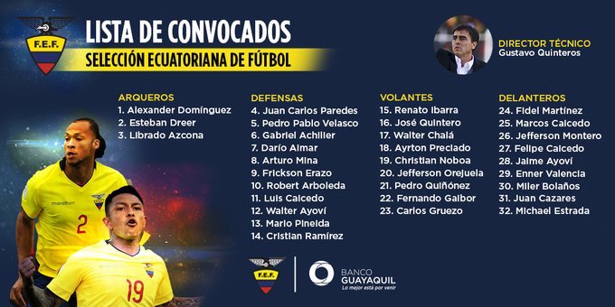Delanteros: Jefferson Montero (Swansea-ING), Fidel Martínez (Pumas-MEX), Enner Valencia (Everton-ING), Felipe Caicedo (Espanyol-ESP), Juan Cazares (Atlético Mineiro-BRA), Jaime Ayoví (Godoy Cruz-ARG), Miller Bolaños (Gremio-BRA), Walter Chalá (Deportivo Cuenca), Marcos Caicedo (Barcelona), Michael Estrada (El Nacional).